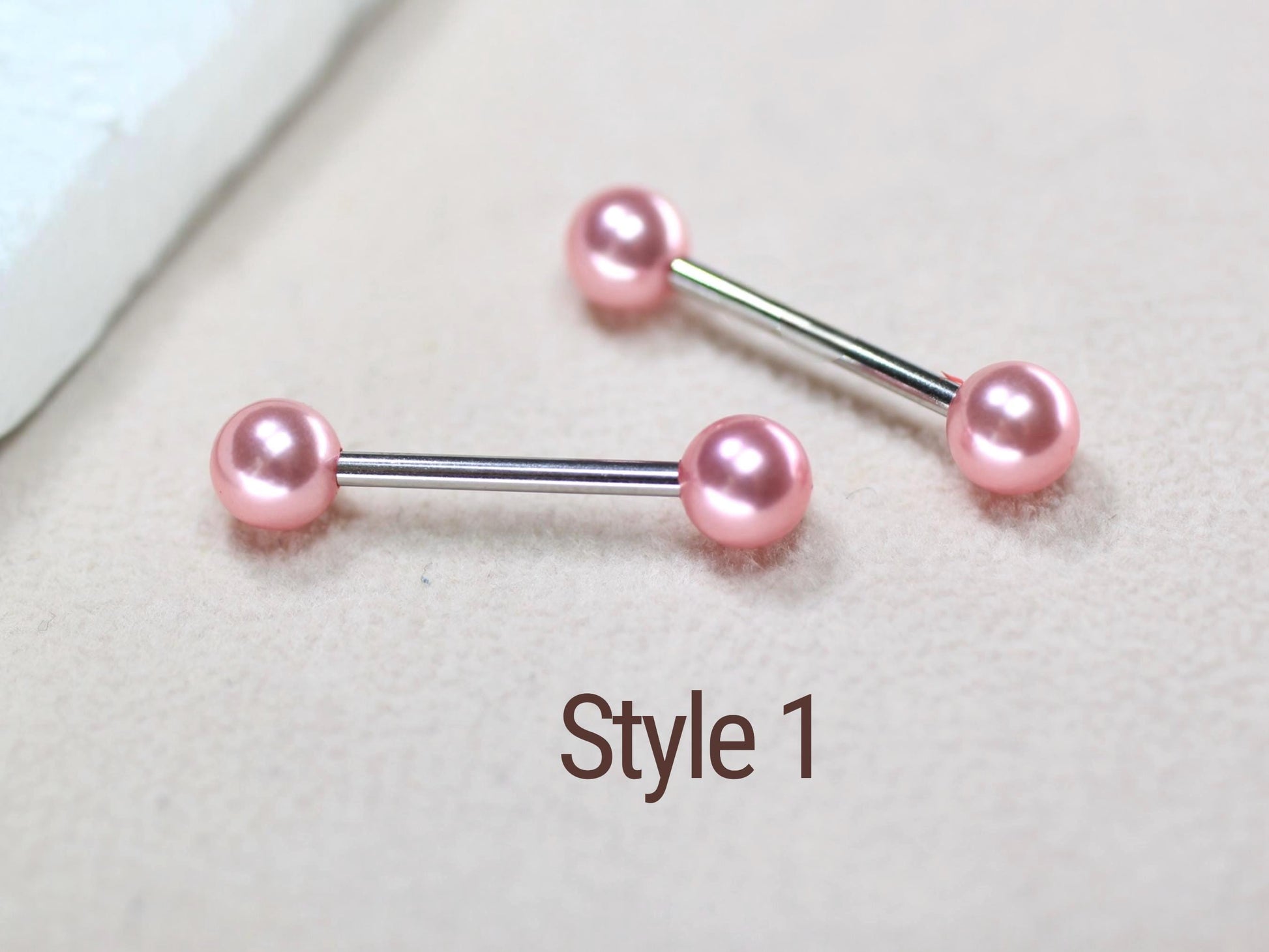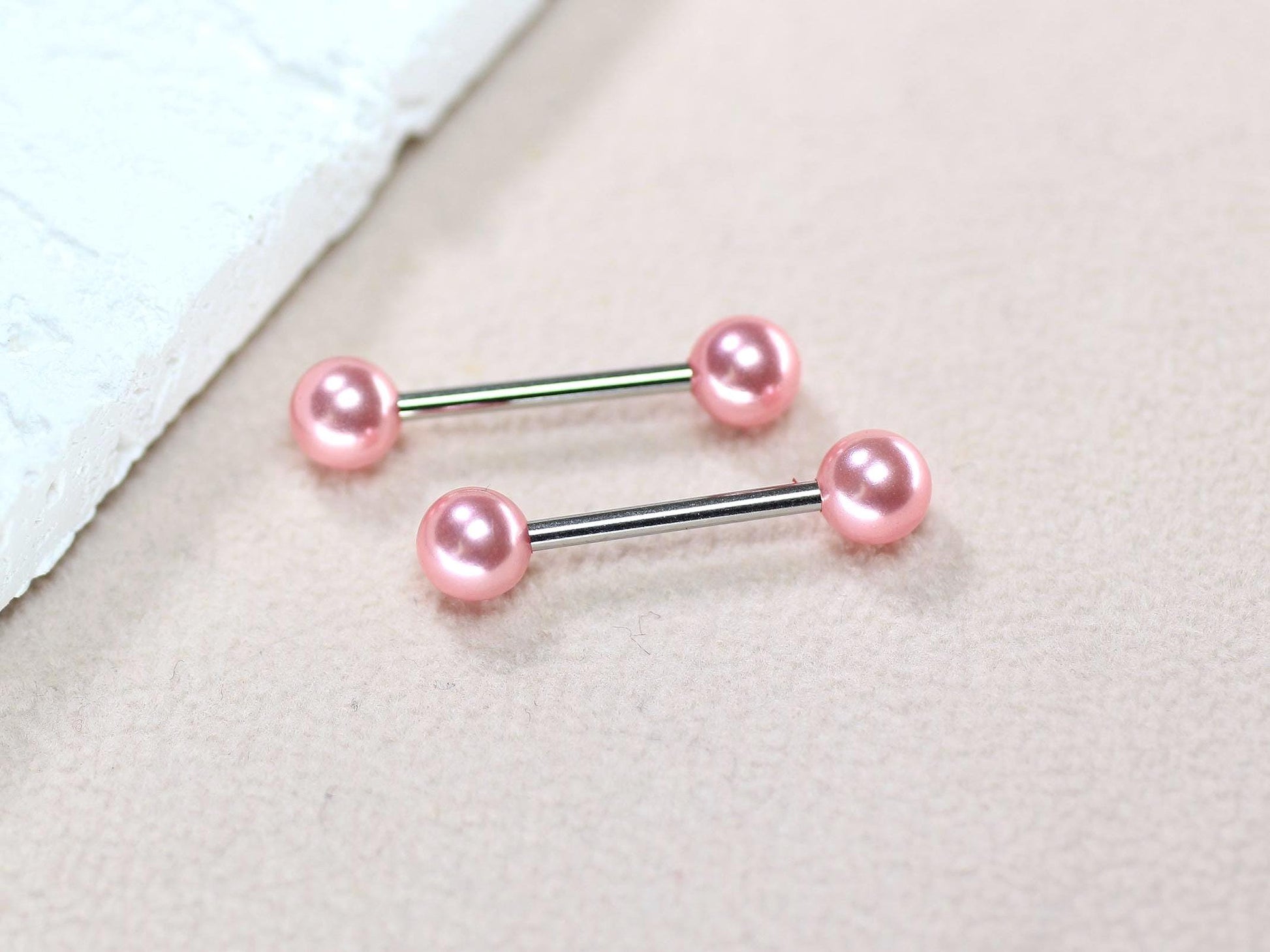 - Set of dainty pink pearl ends nipple piercing barbell.
